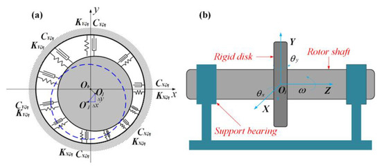 To study the rotor dynamic response under the linear and nonlinear coefficient model, the dynamic model of the rotor–bearing system was established. As shown in Figure 3b, the equation of motion of the rotor–bearing system can be expressed as follows: