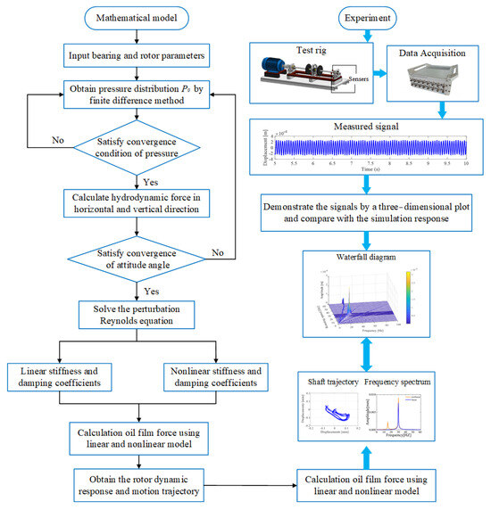 The rotor motion equation is iteratively solved using the Runge–Kutta numerical integration to determine the rotor’s position and velocity at each time step. A stable rotor vibration response is obtained through a certain number of iterations. The complete flow of the proposed nonlinear stiffness and damping coefficient calculation model, along with its validation method, is shown in Figure 4, with the specific simulation parameters listed in Table 1.