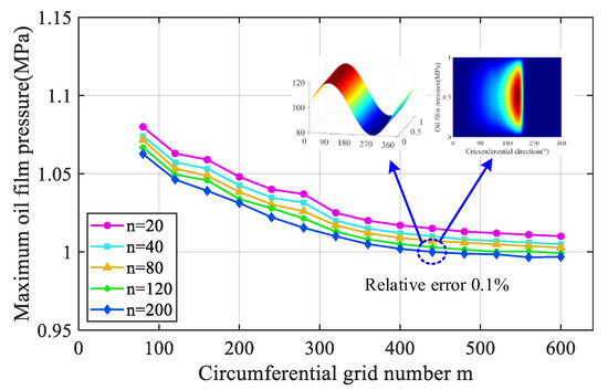 Generally speaking, a larger grid number results in higher calculation accuracy and significantly increases calculation time. Therefore, in the numerical calculation process, an appropriate number of grids should be selected to ensure high calculation efficiency and convergence accuracy. Figure 5 shows that the changing trend in the maximum oil film pressure slows down significantly, and the relative error is close to 0.1% when the number of circumferential grids is 440 and the number of axial grids is 200. Thus, a grid size of 440 × 200 is selected for the following numerical calculation.