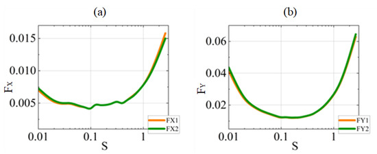 The second perturbation value is . The variation trend of the perturbed force with the Sommerfeld number in Figure 7 is the same as that in Figure 6. However, there are small deviations in the absolute force values between the two methods at moderate perturbation levels. The forces based on second-order coefficients are higher than those based on first-order coefficients.