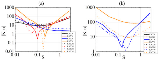 The third perturbation value is , as illustrated in Figure 8. The absolute value of the perturbation reaction force of the oil film decreases with the Sommerfeld number when . The perturbation force amplitude presents an increasing progression with operational speed as the Sommerfeld number increases when , while the linear oil film force has a flat trend. As depicted in Figure 8a,b, the reaction forces evaluated using the two methods are already significantly different at high perturbations. Significant differences are found at both low and high Sommerfeld numbers. The absolute values of the forces based on the second-order coefficients are generally much higher than the absolute values of the forces based on the first-order coefficients when and .