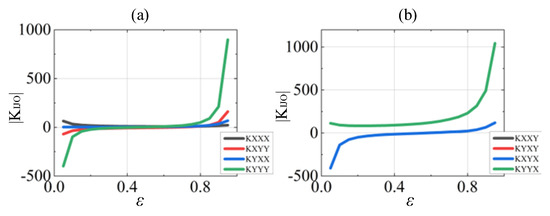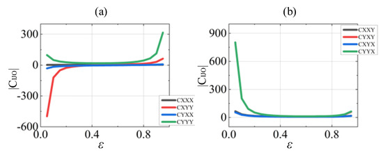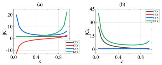 The variation trends of the linear and nonlinear dynamic coefficients with different eccentricities are described in Figure 12, Figure 13 and Figure 14. In Figure 12a, the absolute values of the linear stiffness and damping coefficient are high when the eccentricity is and , and tend to zero near the eccentricity . The absolute values of the nonlinear coefficients far exceed the linearized values when the eccentricity is and , as illustrated in Figure 13 and Figure 14. In particular, the nonlinear coefficients are almost thousands of times higher than the linear results as the eccentricity approaches 0.05 and 0.95.