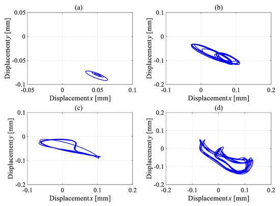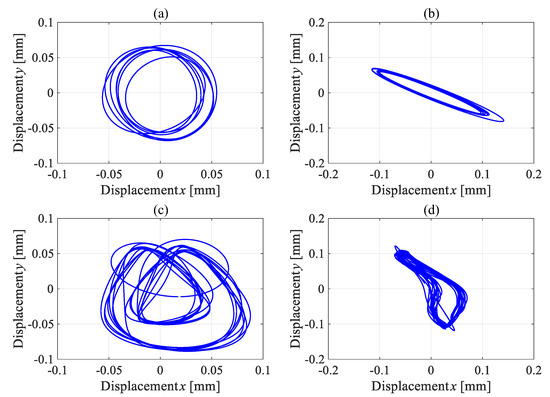 Shaft trajectory with linear and nonlinear coefficients at high rotational speed: (a) linear coefficients at speed of 30 Hz; (b) linear coefficients at speed of 50 Hz; (c) nonlinear coefficients at speed of 30 Hz; (d) nonlinear coefficients at speed of 50 Hz.