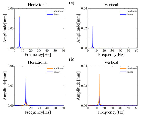 Frequency spectrum at low rotational speeds of 6 Hz and 14 Hz: (a) linear coefficients; (b) nonlinear coefficients.