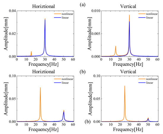 Frequency spectrum at high rotational speed of 30 Hz and 50 Hz: (a) linear coefficients; (b) nonlinear coefficients.