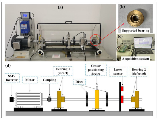 Experiment test rig configuration: (a) picture of test rig; (b) journal bearing; (c) acquisition system; (d) scheme of test rig configuration.