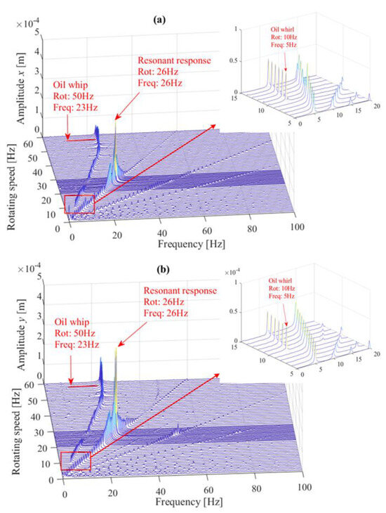 At very low rotational speeds, the frequency components of the rotor’s motion are primarily the rotational frequency and low-order harmonics. The oil whirl begins at around a rotational speed of 10 Hz. In this range, the rotor’s vortex amplitude is relatively small, and the primary energy remains in the form of synchronous vibrations. The system’s first-order critical rotational speed is approximately 26 Hz. The rotor vibrates intensely, and all frequency components other than the rotational frequency are suppressed. When the rotational speed continuously rises to twice the first-order critical rotational speed, oil whip occurs, and the vibration energy of the oil film instability is the dominant component of the whole system. The phenomenon of oil film instability confirms the calculation result of the nonlinear stiffness and damping coefficients.