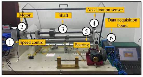 In this case, we use the HUST bearing dataset, being provided by Huazhong University of Science and Technology, Wuhan, China [36]. The bearing fault tests were conducted using a spectra-quest mechanical fault simulator, as depicted in Figure 2. We use four different health status bearings, including medium ball fault (label 1), medium inner race fault (label 2), medium outer race fault (label 3), and medium combination fault (label 4), as illustrated in Figure 3. It is important to note that combination fault denotes a fault in both the inner race and outer race. The type of tested bearings is ER-16K. A total of four different operating conditions were set in experiments. The operating conditions include 65 Hz, 70 Hz, 75 Hz, and 80 Hz. The sampling frequency is set to 25.6 kHz. By placing a tachometer and three-way acceleration sensor in different positions, four sensor signals are obtained, including speeed signal, and vibration signals in the x, y, and z directions.