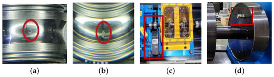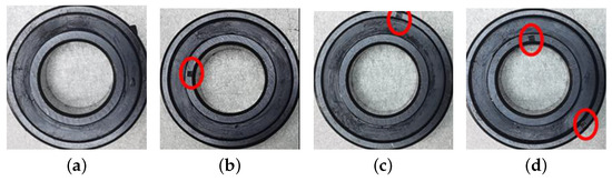 Photographs of the HUST fault bearings. (a) Ball fault. (b) Inner race fault. (c) Outer race fault. (d) Combination fault.