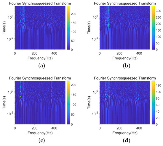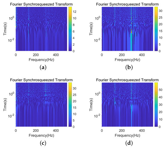 Similarly, based on the KAIST dataset, the FST time–frequency images of vibration signal on B bearing seat x-direction under four different health states are shown in Figure 10. It can be observed from Figure 10 that there are significant differences in the time–frequency images of different faults. Therefore, we will also use FST to obtain time–frequency features and reconstruct them into feature tensors to achieve effective fault identification.