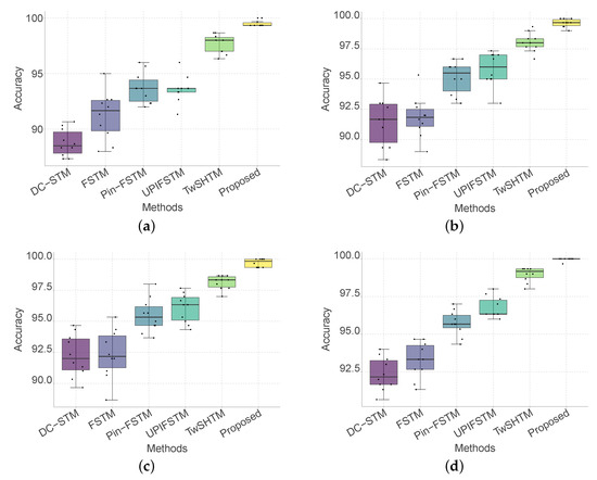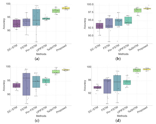 In addition, based on the accuracy indicator obtained from 10 independent repeated experiments, we plot box plots of different methods under the four SNRs experiment, as shown in Figure 11. For the SNR = 1 experiment, the box plot lengths of Pin-FSTM, FSTM, and DC-STM are relatively long, while the box plot lengths of TwSHTM, UPIFSTM, and the proposed model are relatively short, indicating that the results of the Pin-FSTM, FSTM, and DC-STM models are more dispersed, while the results of TwSHTM, UPIFSTM, and the proposed model are more concentrated, which is consistent with the standard deviation results of 4.36%, 2.11%, 1.46%, 0.94%, 0.54%, and 0.48% of the corresponding models in Table 5. In four different SNR experiments, the median of the proposed model is higher than other comparison methods, and the box length is the shortest, indicating that the average level of the 10 independent repeated experiments of the proposed model is relatively high and the results are relatively concentrated.