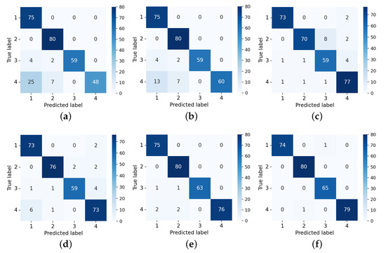 Next, to compare the predictive performance of different methods on positive and negative class samples in detail, we calculate the confusion matrice of each method in the SNR = 1 experiment. The results as shown in Figure 6. It should be noted that the results in Figure 6 are of one of the ten repeated experiments. From Figure 6, it can be seen that DC-STM, FSTM, TwSHTM, and the proposed method can correctly identify the first and second types of fault samples. However, DC-STM and FSTM cannot effectively identify the third and fourth types of fault samples, especially prone to misidentifying the fourth type of fault samples as the first and second types. For the second type of fault samples, Pin-FSTM has the worst recognition results. For the third type of fault samples, TwSHTM and the proposed method have better recognition performance than other comparison methods; specifically, the proposed method can correctly identify the third type of fault samples. In addition, for the fourth type of fault samples, the proposed method also achieved the highest recognition rate. In summary, the proposed method has the best overall recognition performance for the four different types of fault samples.