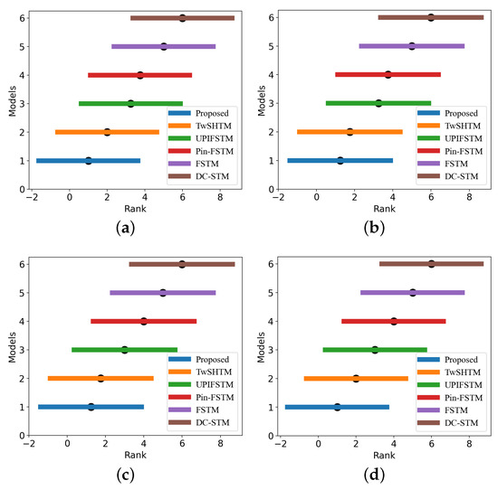 Next, for the KAIST dataset, we also calculate the confusion matrix for each method in the four SNR experiments, as shown in Figure 12. From Figure 12, all methods can correctly identify the first and second types of samples. For the third type of sample, Pin-FSTM is prone to misidentifying it as the fourth type of sample, resulting in the worst recognition performance. Other methods can achieve correct recognition of the third type of sample. For the fourth type of sample, DC-STM, FSTM, UPIFSTM, and TwSHTM have poor diagnostic performance and are prone to misidentifying it as the third type of sample, while Pin-FSTM and the proposed method have good diagnostic performance. Overall, the proposed method can achieve global optimal diagnosis for four different types of samples. Finally, we conduct Nemenyi tests on the performance of different models under the accuracy, precision, recall, F-score indexes, and the results are shown in Figure 13. The confidence level is set to 0.05. From Figure 13, under the four indexes, the proposed model is always the leftmost, indicating the highest ranking and outstanding performance of the proposed model.