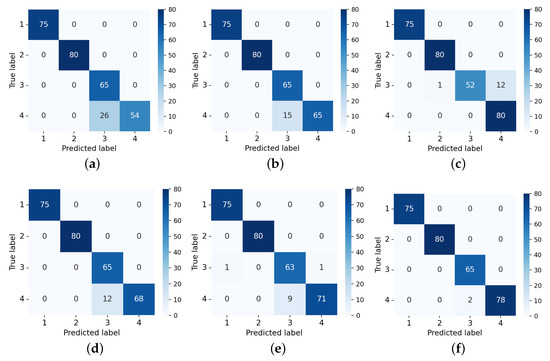 Confusion matrices of different methods in KAIST bearing dataset. (a) DC-STM. (b) FSTM. (c) Pin-FSTM. (d) UPIFSTM. (e) TwSHTM. (f) Proposed.