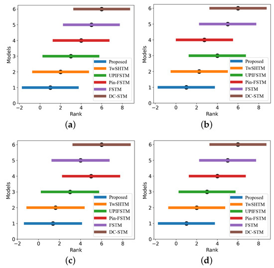 Nemenyi test for models performance in KAIST bearing dataset under different indexes. (a) Accuracy. (b) Precision. (c) Recall. (d) F-score.