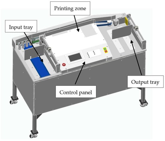 The postal envelope canceling machine is an automated device designed to mark and void stamps on mail items, ensuring their validation and preventing reuse. Equipped with a continuous feeding system, this machine processes large volumes of mail quickly and accurately, stamping postage marks, postmarks, or tracking codes according to postal standards. Its efficient operation and compact design make it an essential tool in post offices and distribution centers, optimizing the processing flow and ensuring the security of the postal service. The machine is divided into three main zones: input tray, printing zone, and output tray, as shown in Figure 1. The machine has overall dimensions of 1500 mm wide, 712 mm deep, and 1200 mm high, with a weight of 175 kg. Figure 2 displays the machine without its protective covers to provide a clearer view of the mechanical components and sensor layout. The machine includes two limit switch sensors at the end of each tray to stop the machine if the trays are empty or full. In addition, the machine has a photo-sensor that determines if there have been letters stuck along the printing belts.