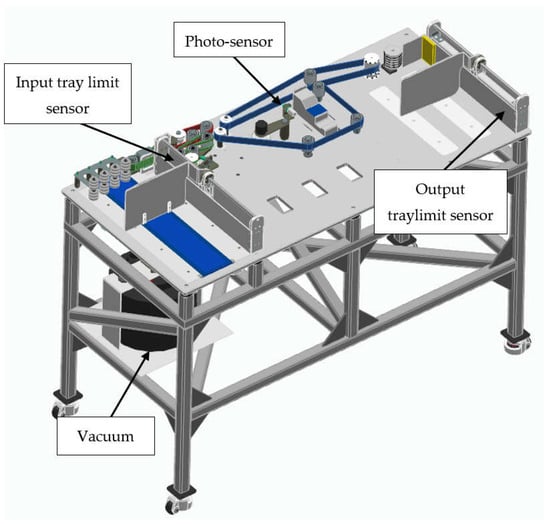 The next step is to assemble the input tray composed by DC stepper motor, input belt, and limit switch sensor number one, as shown in Figure 10.