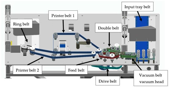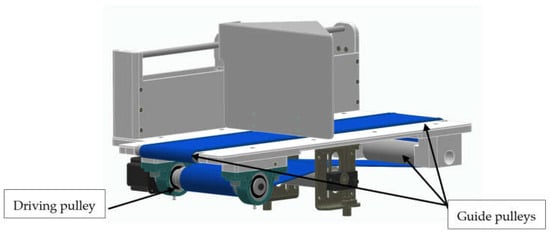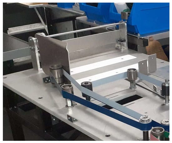 To address these limitations, our proposal introduces an optimized electromechanical cancellation machine that maintains suitable processing capacity through a more accessible, modular, compact, and energy-efficient design. This solution prioritizes constructive simplicity and ease of maintenance without compromising process effectiveness. The design is mainly based on a set of conveyor belts. Conveyor belts are components widely used in industrial machinery []. The conveyor belt must be correctly tensioned to provide a reliable and long-lasting lifecycle in operation [,]. Understanding the interactions between the envelope and the two belts during the postal mail conveying by a sorting machine is essential to optimizing and ensuring the correct operation of any postal processing machine []. Recent electromechanical innovations may be included in the design, such as magnetic gears [] or electromechanical actuators [,]. These elements may be connected to the motor actuators to generate a directly reduced drive, eliminating the necessity of some driving belts, increasing lifecycle and reliability, and also increasing efficiency and reducing noise. However, costs must be deeply analyzed before the implementation. The design must be fully compliant with the European machine regulations [].