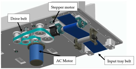 Input tray stepper motor and drive belt with an AC motor.