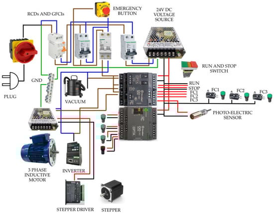 The design of the electronic and control circuit ensures reliable and precise performance, allowing the machine to meet the established operational and safety requirements. Figure 7 shows a diagram of power and control circuit connections.