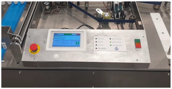 In Figure 14, the control panel—the stop and go push button, safety switch, printer control screen, and indicative LEDs—are installed on the front of the canceling machine.