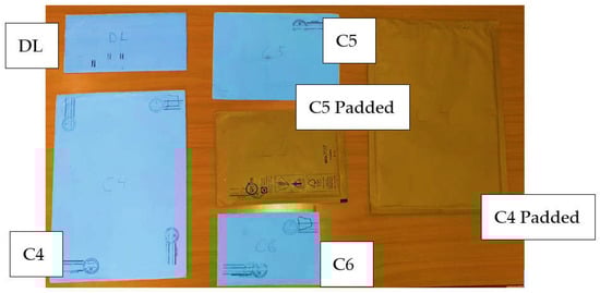 The capacity and speed of the machine in the cancellation of envelopes have been evaluated. Different types of envelopes with different thicknesses and of different types and sizes have been evaluated. Specifically, the following types of envelopes were used: DL, C4, C5, C6, C4 padded, and C5 padded (see Figure 17).