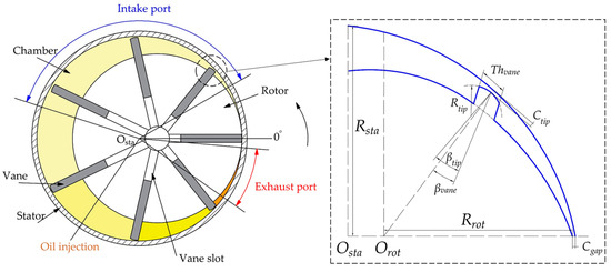 The main components of the RVC include a rotor, a stator and some vanes. Figure 1 displays a typical seven-vane RVC including port positions. The rotor and the stator axes are eccentric. The rotor has equally spaced slots along its surface to host vanes. Due to the centrifugal forces and vane back pressure, each vane slides along the vane slot toward the stator’s inner surface. With the rotation of the rotor, the deforming chambers enclosed between the stator, rotor and vanes are periodically created. This process enables the suction, compression and exhaust of gas. Table 1 shows the key structural parameters of the RVC. Referring to previous investigations on vane machines of similar dimensions [35,36], the vane tip clearance remains unchanged at 50 µm. This assumption is based on both physical and numerical considerations. In reality, a minimum clearance is required to account for the presence of the oil film, which prevents direct mechanical contact between the stator and the rotor, while in the numerical method, the consideration of the vane tip clearance region benefits produce an “O” topology of the rotor mesh. The tangential clearance between the stator and the rotor is also fixed to be 50 µm in this work. Both the vane tip and the tangential clearances contribute to internal leakage, which ultimately results in a decrease in volumetric efficiency.