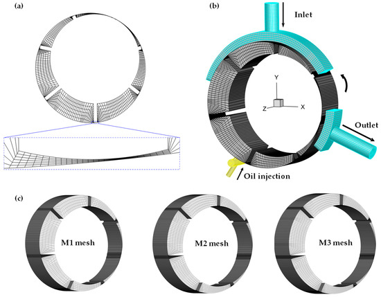 Grid generation of RVCs is a key step in performing CFD simulations due to the challenge of representing the moving and deforming rotor domain. A fully analytical grid generation method proposed in a previous study by the authors was utilised in this work. The detailed mesh generation method can be seen in ref. [37]. The computational domain is divided into the core region and the port region. The former is discretised through the aforementioned analytical grid generation approach, and the latter is treated using the traditional grid generation tools in the ANSYS software 18.0 suite. The resulting computational mesh is displayed in Figure 2. Figure 2a shows a two-dimensional rotor mesh with a local magnified view of vane tip clearance, while Figure 2b illustrates a three-dimensional mesh for rotor and port domains. Since the primary focus is on main flows instead of boundary layers, the present work does not take inflation layers into account, which also leads to a smaller mesh count and shorter computational time.