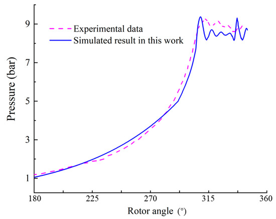To validate the gas–liquid two-phase CFD model of the RVC established in this work, the obtained simulated data are compared to the corresponding experimental results [8]. Figure 3 shows the pressure trace varying with the rotor angle between the previous experimental test and the present simulation. As a result, the maximum difference between experimental and simulated pressure is less than 5.0% within the testing range. This difference may result from the simplification of no axial leakage clearance in the geometrical model. Consequently, the numerical method established in this work is considered credible to simulate the flow characteristics and the working performance of RVCs.