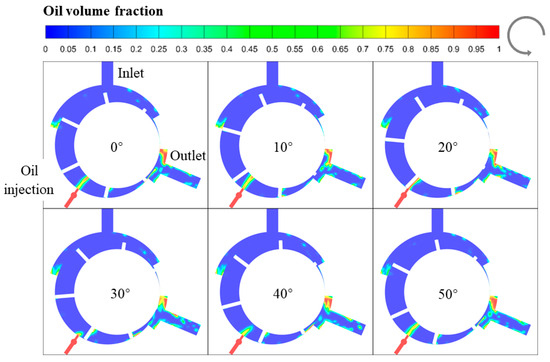 The oil distribution at mid-length of the RVC throughout a full cycle is illustrated in Figure 4. The oil is injected into the chambers radially at the rotor angle of 236°. The oil tends to spread along the leading edge of the vanes. Then, due to the high viscosity, the oil accumulates on the surface of the rotor outer wall, the stator inner wall and the vane side wall. The local oil accumulation blocks oil–gas mixing, thereby impacting the cooling performance. With the rotation of the rotor, the accumulated oil tends to flow into the vane tip gap, resulting in better sealing lubrication performance at the vane tip region. The narrow clearance at the vane tips restricts the oil entry when the vanes pass along the injection port, which causes a reduction in the flow rate of the oil, as observed at the rotor angle of 20° in Figure 4. During the exhaust stage, the mixing of oil and air becomes more uniform, resulting in sufficient air cooling. Ultimately, most oil exits through the exhaust port, and the rest leaks through the tangential gap to the next cycle.