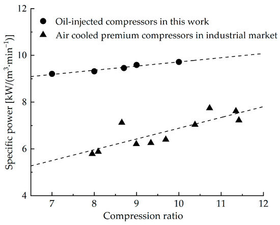 In this work, the performance of the RVC is evaluated by volumetric and adiabatic efficiencies and specific power whose definitions are referenced in [34]. The RVC reference case obtains the volumetric and adiabatic efficiencies of 95.4% and 62.3%, respectively, and the specific power of 9.47 kW/(m3·min−1). A comparison of the compressor performance between this work and in industrial market technology is reported in detail in ref. [34] and briefly recalled here. The specific power against the compression ratio obtained in this work is compared to the one in existing technology [39], as shown in Figure 5. Both air-cooled RVCs in the market and oil-injected RVCs in the present study almost linearly increase with compression ratio. Nevertheless, the specific power in market compressors is lower than that obtained in this work. One reason for this result is the difference in cooling approaches. Oil-injected approach belongs to an internal-cooling category, while the air-cooled method is an external-cooling category. Also, an oil jet rather than an oil spray is utilised in the present study, which results in larger energy consumption. For both cooling approaches, the specific power almost increases linearly with the compression ratio. That is to say, the variation trend is the same, which ulteriorly validates the reliability of the simulated results.