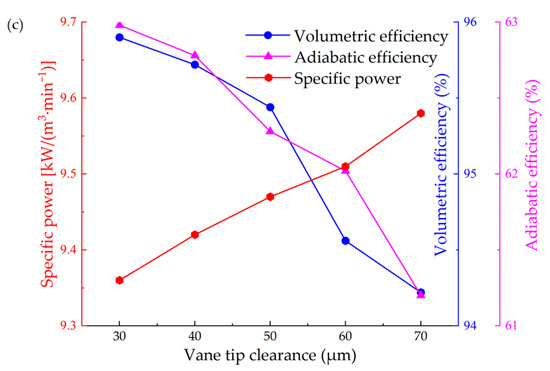 In the present work, the vane tip clearance ranges from 30 to 70 μm. Figure 6 shows the flow field at vane tip clearance with different clearance sizes and the impact of tip clearance on compressor performance. The vane tip leakage channel can be regarded as a nozzle. It can be seen from Figure 6a,b that the pressure gradient and oil volume fraction in the nozzle region are similar with different clearance sizes. Larger tip clearance leads to larger tip leakage and consequently lower volumetric efficiency, which is consistent with the result in Figure 6c. Also, larger leakage results in lower air capacity and, consequently, higher specific power. This is also consistent with the result shown in Figure 6c, that the specific power steadily increases with tip clearance from 30 to 70 μm. Specifically, the volumetric efficiency steadily reduces from 95.9% to 94.3% with the tip clearance from 30 to 70 μm. Similarly to volumetric efficiency, the adiabatic efficiency declines from 63.0% to 61.3% with the vane tip clearance from 30 to 70 μm. This is because larger clearance leads to lower adiabatic work due to the reduced seal effects. The specific power defined by the actual work to the air volumetric capacity improves from 9.36 to 9.61 kW/(m3·min−1) with the vane tip gap from 30 to 70 μm. Larger clearance leads to a worse seal effect and consequently decreases the air-flow rate, while larger tip leakage decreases the actual work at the same time. Considering the impacts of the tip clearance on both the air-flow rate and the actual work, the specific power increases steadily with the vane tip clearance. From the above analysis, the RVC as a high-efficiency compressor highly depends on the vane tip gap size. It would be significative to reduce the vane tip clearance through advanced technical methods.