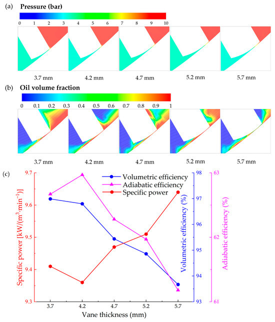 Despite the vane tip clearance size remaining unchanged at 50 μm, the vane thickness affects both the volume of the chambers and the length of the vane tip leakage channel. Figure 7 shows the flow field at vane tip clearance with different vane thicknesses and the impact of vane thickness on compressor performance. It can be seen from Figure 7a that thicker vanes result in a lower pressure gradient in the nozzle region, which helps to reduce leakage. As shown in Figure 7b, the oil volume fraction is relatively higher at 4.2 mm vane thickness, which may contribute to improving compressor performance. A larger vane thickness reduces the theoretical flow rate (due to the reduction in displacement volume of the chambers) and the simulated flow rate at the same time, leading to a steady decrease from 96.9% to 93.7% in the volumetric efficiency with the vane thickness from 3.7 to 5.7 mm, as illustrated in Figure 7c. A cumulative, yet counterflow effect is that a thin vane offers smaller resistance to leakage flow. Pressure diffusion and leakage are higher across thinner vanes compared to thicker vanes, which means that the vane tip leakage reduces with the vane thickness from 3.7 to 5.7 mm. An optimum vane thickness that balances, leakage with the reduction in geometrical chamber volume thus exists. As seen in the result of Figure 7c, the adiabatic efficiency wholly decreases from 62.9% to 61.2%. While the specific power decreases from 9.41 to 9.36 kW/(m3·min−1) with the vane thickness from 3.7 to 4.2 mm and increases to 9.64 kW/(m3·min−1) as the vane thickness further increases to 5.7 mm. The synthetic effect leads the specific power, defined as the ratio of the actual work to the capacity, to reach its lowest value of 9.36 kW/(m3·min−1) at the vane thickness of 4.2 mm. From the results, a vane thickness of 4.2 mm is recommended for the present RVC.