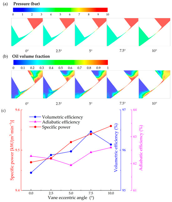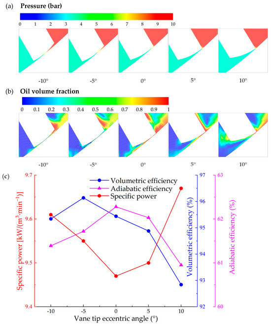 Effect of vane eccentric angle on compressor performance: pressure field at vane tip gap (a), oil distribution at vane tip gap (b) and impact on specific power, adiabatic and volumetric efficiencies (c).