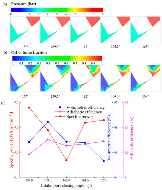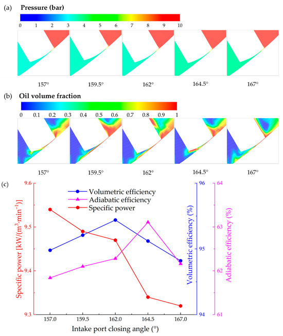 The intake port should be carefully designed, which needs to ensure an adequate intake process, as well as not affect the compression process. Figure 11 shows the flow field at vane tip clearance with different intake port closing angles and the impact of intake port closing angle on compressor performance with a fixed intake port opening angle of 30°. As shown in Figure 11a, the pressure gradient in the nozzle region is relatively lower for intake port closing angle = 159.5°, leading to smaller tip leakage and, consequently, higher volumetric efficiency, which is consistent with the result in Figure 11c. In Figure 11b, the average oil volume fraction is relatively higher for intake port closing angle = 162°, which contributes to achieving better performance of RVC. This is also consistent with the result shown in Figure 11c, that the specific power reaches its bottom at the intake port closing angle of 162.0°. The suction of air is more complete with an increase in the intake port closing angle due to the longer gas filling time, while the compression of the air may be not adequate due to the shorter gas compression time. As a consequence, the volumetric efficiency increases from 95.4% to 96.2% with the closing angle from 157.0° to 159.5° and decreases steadily from 96.2% to 94.6% with the closing angle from 159.5° to 167°. The adiabatic efficiency shows a slight increase with the closing angle from 157.0° to 159.5° and then almost remains constant with the closing angle from 159.5° to 167°. As the closing angle increases from 157.0° to 162°, the specific power obviously decreases from 9.68 to 9.47 kW/(m3·min−1) and then significantly increases to 9.63 kW/(m3·min−1), which also obtains its bottom at the angle of 162°. From the results, an intake port closing angle of 162° is suggested for the RVC if the intake port opening angle is fixed at 30°.