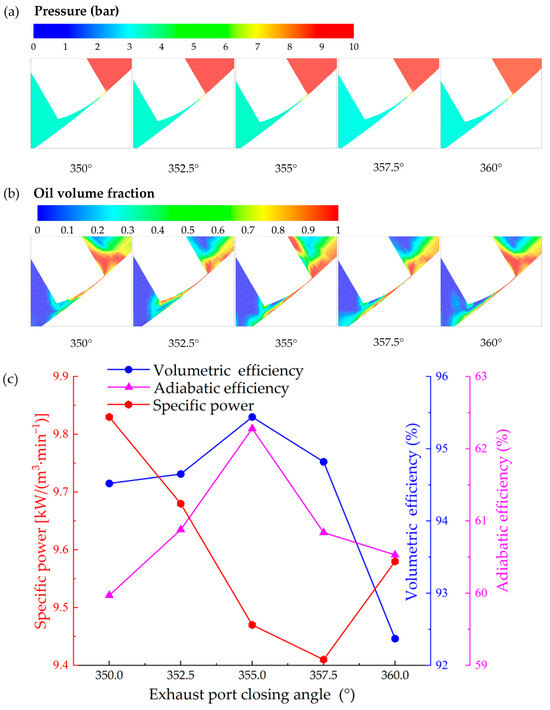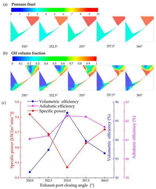 To ensure the adequate exhaust process of the air, a fixed exhaust port span angle of 30° is controlled to study the impacts of the exhaust port closing angle on the compressor performance. Figure 14 shows the flow field at vane tip clearance with different exhaust port closing angles and the impact of exhaust port closing angle on compressor performance. As shown in Figure 14a, the pressure gradient in the nozzle region is relatively lower for the exhaust port closing angle = 355°, leading to smaller tip leakage and consequently higher volumetric efficiency, which is consistent with the result in Figure 14c. In Figure 14b, the average oil volume fraction is relatively higher for exhaust port closing angle = 355°, which contributes to achieving better performance of RVC. This is also consistent with the result shown in Figure 14c that the specific power reaches its bottom at the exhaust port closing angle of 355°. It should be noted that a larger exhaust port closing angle would lead to larger tangential leakage. As a consequence, both the volumetric and adiabatic efficiencies increase with the closing angle from 350° to 355° and then decrease with the closing angle from 355° to 360°, achieving peak values of 95.4% and 62.3%, respectively, at the closing angle of 355°. The specific power decreases sharply from 9.82 to 9.47 kW/(m3·min−1) with the closing angle from 350° to 355° and then increases obviously from 9.47 kW/(m3·min−1) to 9.72 kW/(m3·min−1) with the closing angle from 355° to 360°, reaching its bottom value of 9.47 kW/(m3·min−1) at the closing angle of 355°. Comparing the two schemes studied in Section 5.3 and Section 5.4, the former achieves a more satisfactory result. Around 2.5° expansion in the exhaust port span angle leads to a 0.6% decrease in specific power. Therefore, an exhaust port closing angle of 357.5° with a fixed exhaust port opening angle of 325° is suggested for exhaust port optimisation.