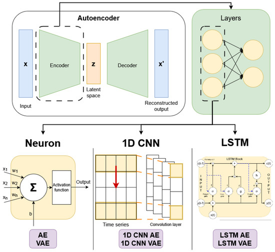 In the AE architecture, the encoder and the decoder are typically composed of standard neuron-based layers. However, in this case, they have also been designed using CNNs and LSTM networks, as depicted in Figure 1.