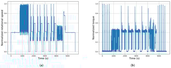 The test bench setup consists of two Permanent Magnet Synchronous Motors arranged in a back-to-back configuration. One motor provides the necessary torque as the traction motor, while the other absorbs the energy as a dynamic brake. Each motor is equipped with a mono-axial accelerometer to measure vibrations during the test, which lasts 1.5 h, which is followed by a same-length period where the motors remain stationary. This cycle is repeated for hundreds of tests to evaluate the lifespan of PMSMs under various combinations of low and high torque and speed (shown in Figure 4), with the added challenge of extreme environmental conditions like high and low temperatures and humidity. This makes fault detection critical, as harsh conditions can lead to premature anomalies in the motor operation.