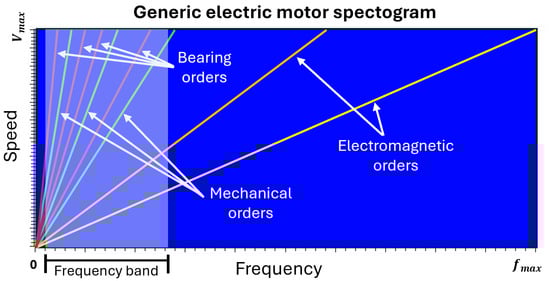 Generic PMSM spectrogram showing mechanical orders, bearing and electromagnetic orders as a function of speed and frequency. The considered frequency band ranges from 10 Hz to 1500 Hz, covering key spectral components related to faults.