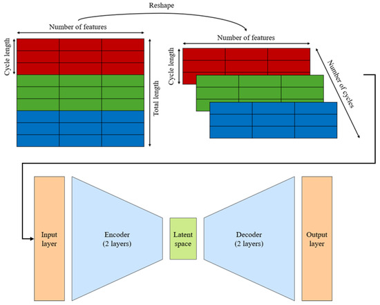 This formula guarantees a data reduction by at least a factor of 40 while ensuring that the resulting length is a power of 2. This condition may be useful during the AE hyperparameter setting [38]. Next, as the datasets have to be used to compare and identify the best AE architecture, the data is normalised and reshaped into smaller 2D blocks, with each block representing one test cycle. This reshaping makes it easier for the AE to learn and identify hidden data patterns during training. The initial dataset with dimensions (total length, number of features) is reshaped into (number of cycles, cycle length, number of features), as shown in Figure 6.