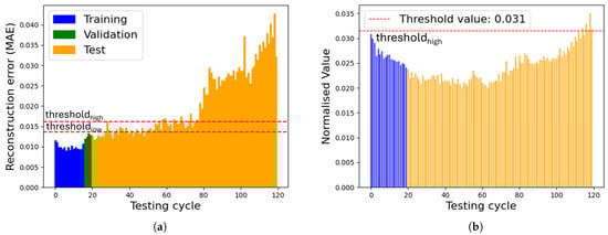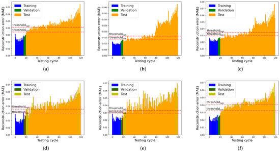 Training data selection assumes that the electric motor starts in a healthy state, with the first testing cycles representing normal operation, free from wear-related faults. This assumption allows the model to train on healthy data, improving the reliability of defect detection in later cycles. A sensitivity analysis determined that 20 cycles provide the best balance between speed and accuracy, with an 80%–20% split into train and validation sets.