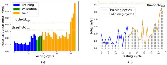 AE vs. mean acceleration value (Beta 1001). (a) Reconstruction error 1D CNN AE, (b) mean acceleration value.