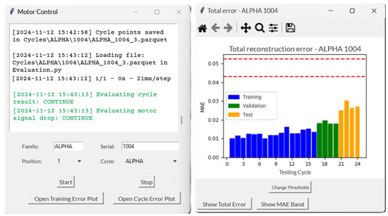 The designed software enables the parallel analysis of multiple motors running the durability test. Test data related to each motor are updated in real time and saved on a dedicated repository, where they are processed for training and for the continuous monitoring of newly available testing cycles. The algorithm allows users to configure network parameters, adjust fault detection thresholds and retrain the model with custom datasets, ensuring optimal performance under varying conditions. A dedicated interface, shown in Figure 14 provides real-time alerts, displays processing status and visualises reconstruction error plots for fault analysis.