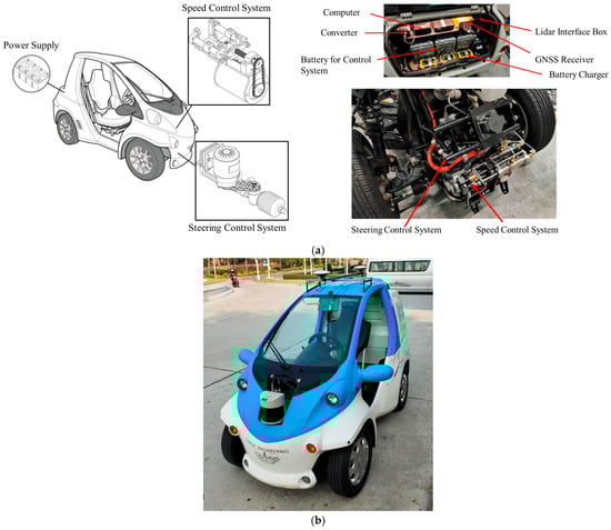 The experimental platform utilized in this study is the Toyota COMS ZAD-TAK30-DS (Toyota Auto Body Co., Ltd., Kariya, Japan), an ultra-compact, single-seat electric vehicle powered by a permanent magnet synchronous motor. With a curb weight of 420 kg and a total length of 2395 mm, the COMS is designed for low-speed urban mobility at typical speeds of 10–15 km/h, making it well-suited for semi-structured environments, such as university campuses []. To enable autonomous operation, the vehicle’s conventional controls were extensively modified at the low-level hardware layer. Custom drive-by-wire systems were integrated for steering, acceleration, and braking, while additional sensors and a dedicated power supply system were installed. These modifications not only enable full autonomous control but also preserve the ability for manual operation, ensuring safe testing and easy intervention when necessary. An overview of the modified vehicle is shown in Figure 1.