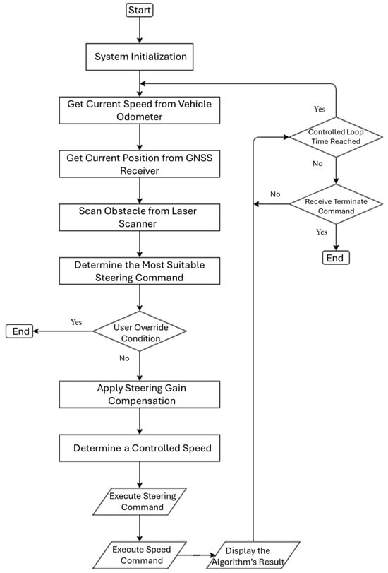 The integration of all subsystems is structured through a layered control architecture that links sensors, processors, and actuators in real time (Figure 4). The design follows a sense–plan–act paradigm, separating high-level decision making from low-level actuation. An onboard Intel i7-based computer (Micro-Star International Co., Ltd., New Taipei City, Taiwan) runs the navigation software, including GNSS-based path following and obstacle avoidance, and communicates with a low-level microcontroller interfacing with the vehicle hardware.