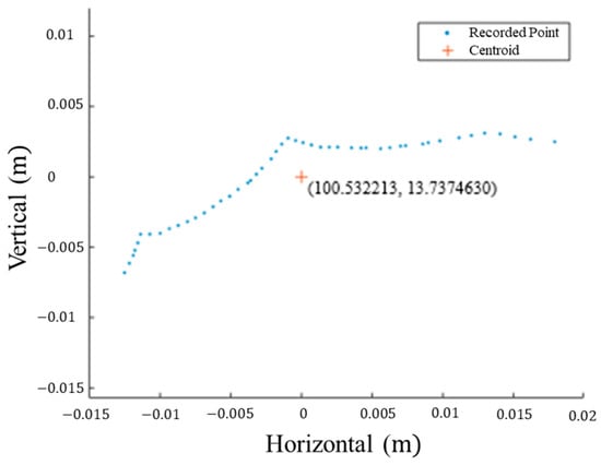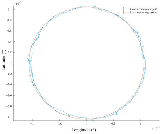 The second phase of experimentation evaluated the system’s obstacle avoidance capability. Trajectory-tracking parameters, including scoring weights, were set based on tuned values from the path-following tests. A single stationary obstacle was introduced onto the course to block the vehicle’s path and trigger an avoidance maneuver. Specifically, a traffic cone (or similar object) of approximately 0.4 m diameter was placed in the center of the lane along the waypoint route. The obstacle’s position was measured using the GNSS receiver to ensure precise placement relative to the predefined path. Multiple GNSS readings showed a variation of only about 4 cm horizontally and 2 cm vertically, indicating consistent positioning. In the vehicle’s internal map, the obstacle was modeled as a circular object of 0.4 m diameter, matching its physical size, for the path planner to avoid. The recorded GNSS position of the obstacle is shown in Figure 9.