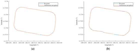 For field tests, the vehicle was placed at an arbitrary point on the closed-loop track and switched to the autonomous mode to follow prerecorded waypoints. The following two fixed speeds were tested: 10 km/h (nominal) and 15 km/h (system limit). The onboard controller managed speed and steering without manual intervention; a safety driver was present but never needed to intervene. During each trial, the GNSS position and heading were logged continuously for postprocessing. Tracking performance was analyzed by comparing the actual trajectory with the target waypoints, evaluating lateral deviations and heading errors. Figure 8a shows the recorded path at 10 km/h, closely matching the reference route, with similar results at 15 km/h as illustrated in Figure 8b.