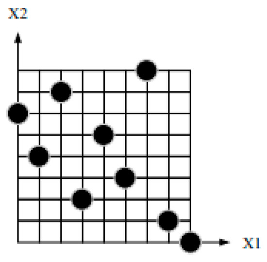 Optimal Latin hypercube design is an improvement of the Latin hypercube design, further enhancing the uniformity of sampling and improving the data fitting accuracy. It demonstrates better spatial filling capabilities and balance. For example, in the case of a two-factor, nine-level analysis sample, the two methods differ in the number of sample points collected and their distribution, as shown in Figure 3 and Figure 4.