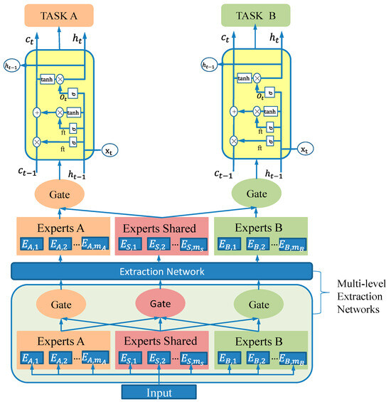 In contrast to the PLE network model framework, PLE-LSTM substitutes the tower layer, which is responsible for fitting the output of each task, with an LSTM neural network. The framework of the PLE-LSTM model is illustrated in Figure 8.