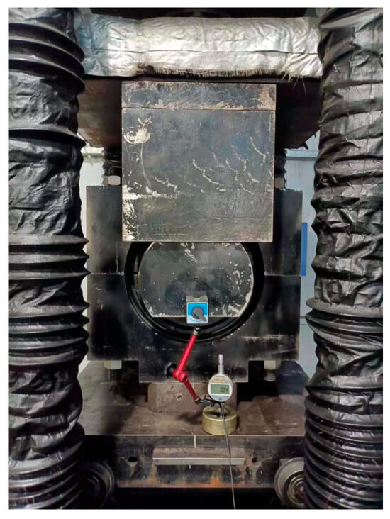 A servo-hydraulic universal testing machine is employed to measure the directional deformation of the gearbox elastic support under varying load values, allowing for the calculation of the bidirectional static stiffness of the entire structure. The experimental setups for evaluating the vertical and lateral stiffness of the gearbox elastic support are shown in Figure 10 and Figure 11, respectively.